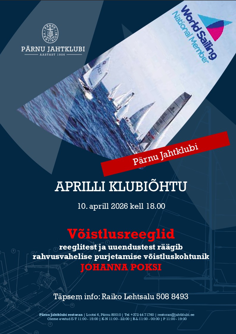 Pärnu Jahtklubi aprilli klubiõhtu toimub 10. aprillil kell 18.00.
