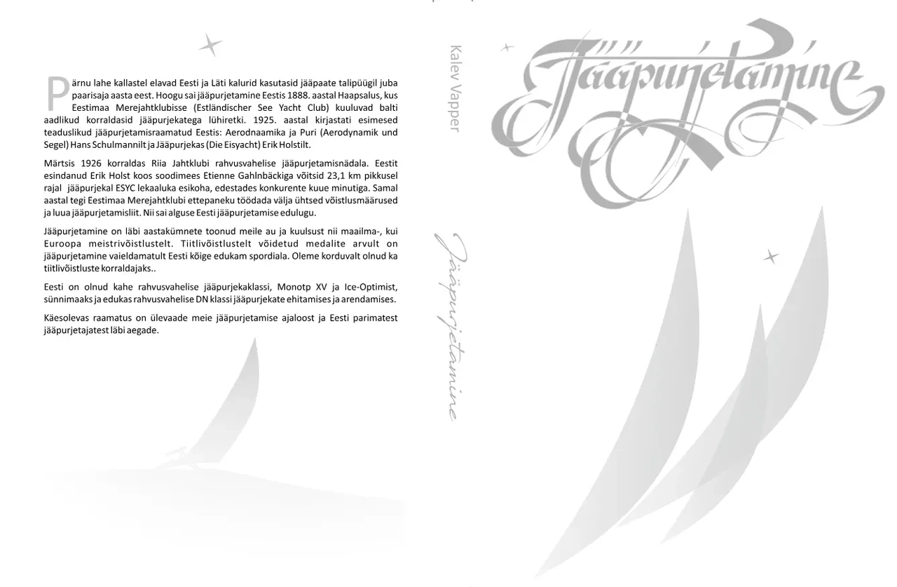 Raamatus JÄÄPURJETAMINE antakse ülevaade nii meie jääpurjetamise ajaloost kui ka edukaimatest jääpurjetajatest. 252-leheküljel räägivad oma purjetaja- ja jääpurjetajateest maailmameistrid Ain Vilde, Mati Kuulmann, Tiit Haagma, Euroopa meistrid Vaiko Vooremaa, Vello Jürjo, Rasmus Maalinn jt. Raamatu lõpus on 12-nel leheküljel ülevaade meie jääpurjetajate tulemustest tiitlivõistlustel.